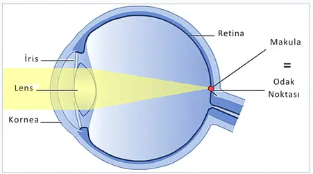 Göz, gelen ışığı retinanın arkasına odaklar.